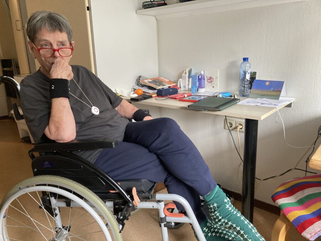 Klaaske manoeuvreert heen en weer tussen rolstoel en rollator – die ze bij voorkeur moet gebruiken als oefening voor thuis. Het wachten is nu op de ergotherapeut voor aanpassingen in ons huis.