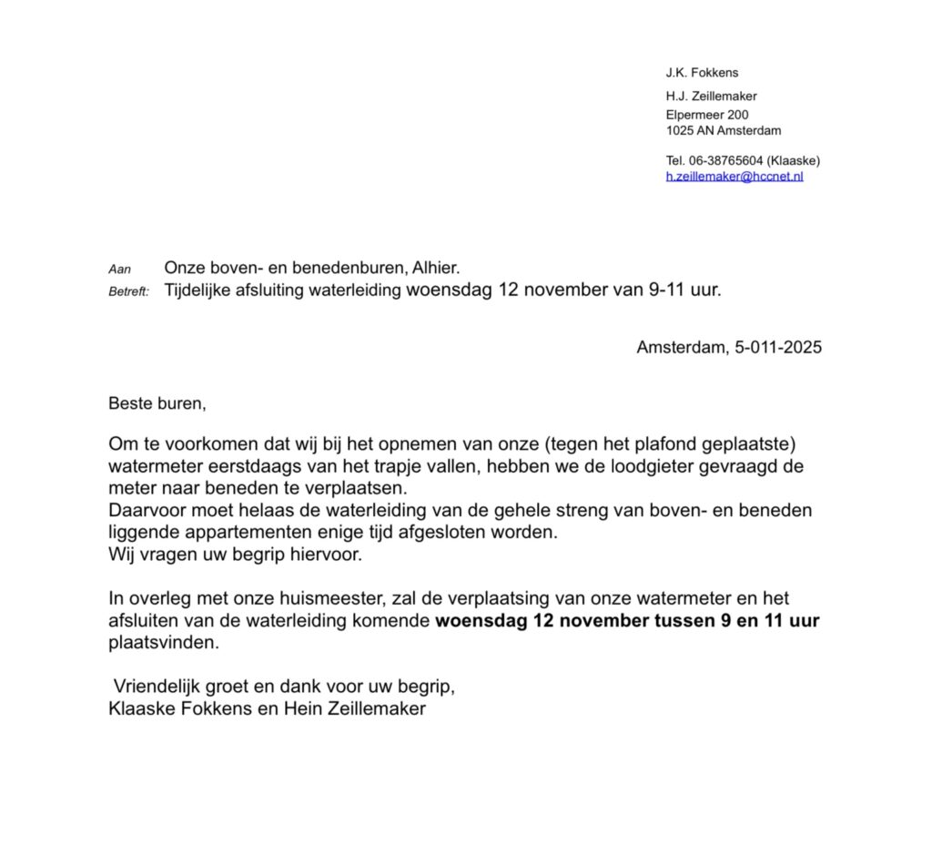 Woensdag 5 november op de MacBook: âŠde buren informeren dat er straks twee uur geen water is: