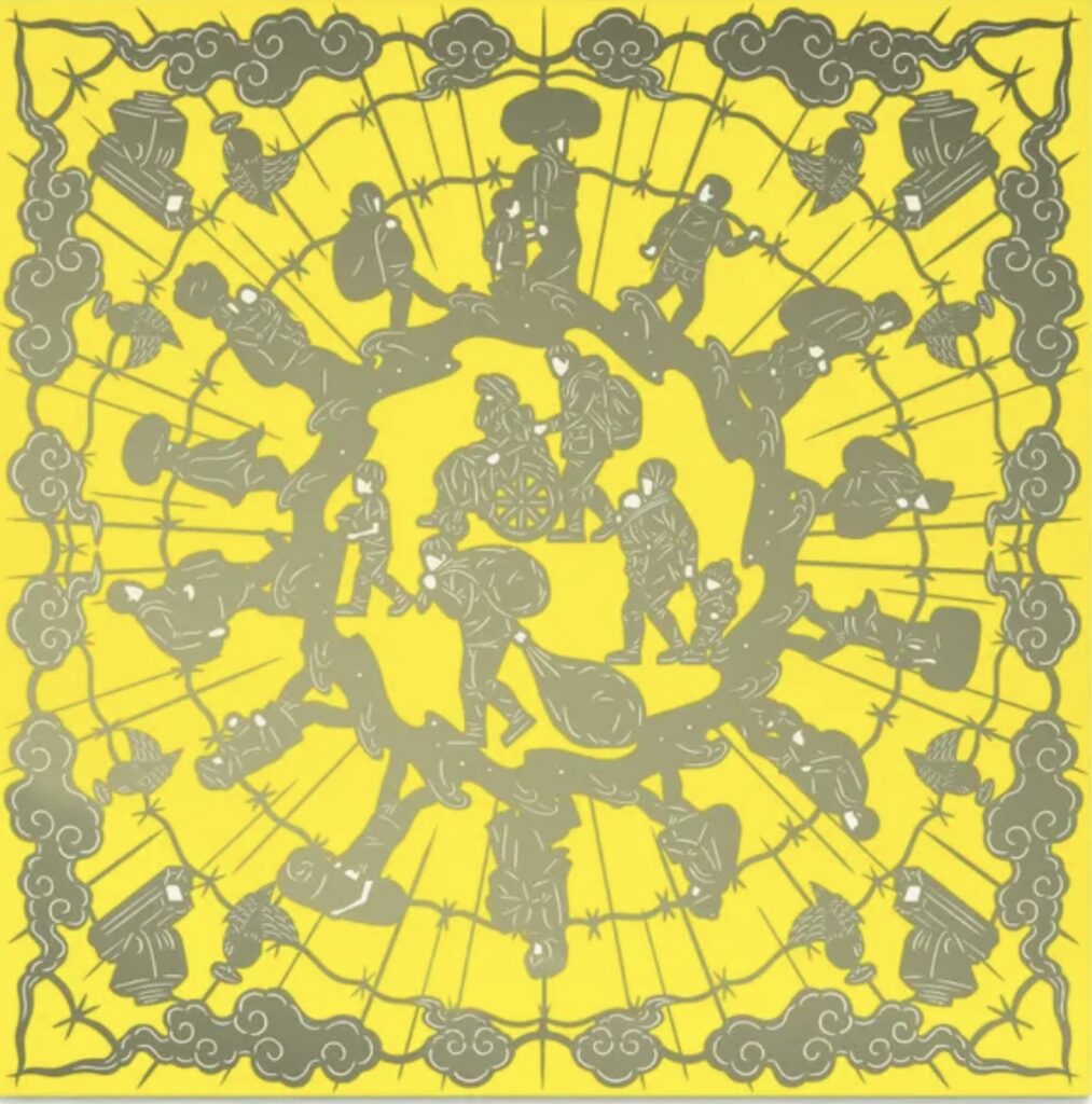 Ai Wei Wei, Human Flow belongs to a trio of artworks by Ai Weiwei which combine innovative printing methods with pillars of freedom upheld throughout his practice. Figures in motion, laden with bags, move in an endless circle at the centre of the print. Razor wire surrounds them. CCTV cameras look on ominously. Ai reflects on the importance of a person’s liberty to move, and the forms of persecution that may lead them to do so. Opaque layers of white and yellow ink are applied to a mirrored aluminium substrate – subsuming onlooker and artwork in the reflective surface.“If there is one refugee, we are all refugees. It’s not that you’re potentially a refugee, or potentially involved. We are involved. We are refugees. This idea is not easy to establish, so I tried to make it beautiful. You can see the image, but you can also see yourself in the reflection.” (www.avantarte.com) [vergroten door te klikken]