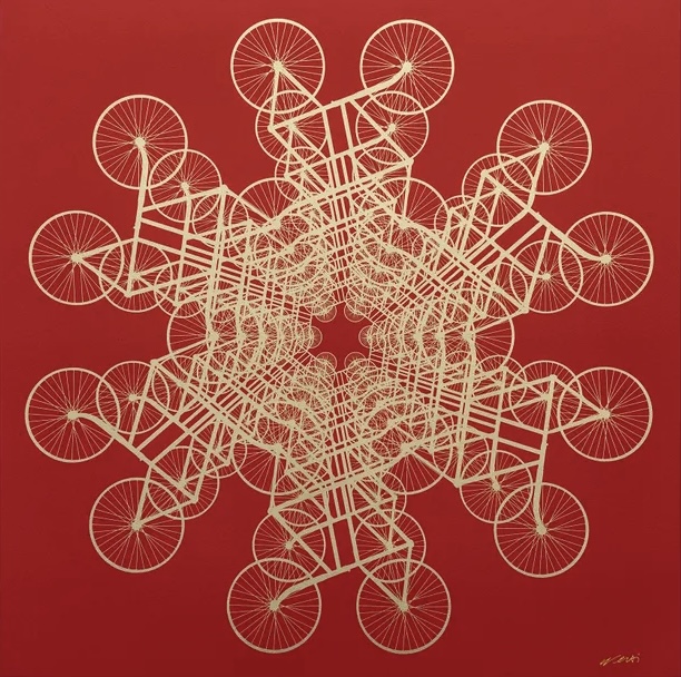 Ai Wei Wei, Forever Bicycle. Throughout his career, Ai Weiwei has used the bicycle as a symbolic motif to explore cultural memory and social change – most prominently in his installation series Forever Bicycles, where thousands of bikes are assembled into towering abstract monuments. Forever Bicycle (Red & Gold) translates the abstract visual language of these seminal bicycle sculptures into a hypnotic two-dimensional form. The piece invites collectors to reflect on themes of mobility, freedom, and our current era of rapid modernisation that has reshaped our global economic and social landscape. Make-Ready, this limited edition print is finished with hand-applied silver leaf. (www.avantarte.com) [vergroten door te klikken]