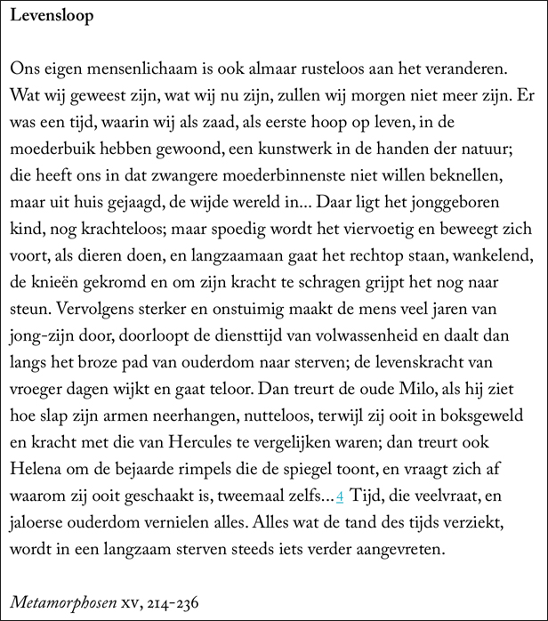 ‘Alles verandert continu, maar niets verdwijnt helemaal’ dat is de boodschap die Ovidius opschreef in zijn Metamorfosen. In het gedicht worden goden dieren, veranderen nimfen in bomen, verstenen mensen en worden stenen mensen. Veel verhalen gaan over de omgang van goden en stervelingen. Liefde speelt een grote rol, lang niet altijd met wederzijdse instemming. Geweld en bedrog komen bovendien geregeld om de hoek kijken. De tentoonstelling belicht de verbeelding van verschillende iconische fabels, zoals de schepping van de kosmos en de wereld uit de vormeloze chaos, het verhaal van de weefster Arachne die door de jaloerse godin Minerva in een spin wordt getransformeerd om eeuwig haar webben te weven of de affaires van Jupiter, de oppergod, die zich keer op keer moest vermommen om zijn jaloerse echtgenote Juno én zijn slachtoffers om de tuin te leiden. Zo vinden we hem als stier, zwaan, gehuld in een nevel of als een regen van goud. (tekst Rijksmuseum)