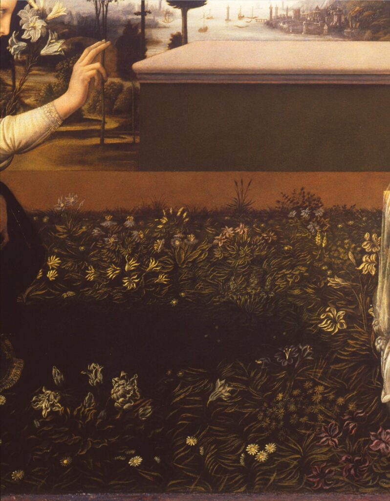 Symboliek Om Maria heen staan in het schilderij vier symbolen: de Spiegel, Jakob’s Ladder, de Hemelpoort en de Toren. Deze symbolen verwijzen naar Bijbelverhalen uit het oude testament die verwijzen naar Maria’s overwinning op het kwaad van de slang. Het zijn verhalen waaruit blijkt dat het geloof sterker is dan de zonde. Jakob’s Ladder is het verhaal van Jakob, die in een droom de hemel bezoekt. De toren verwijst naar een Bijbeltekst uit Hooglied, die een onneembare toren beschrijft. De spiegel verwijst naar een spiegel waarin de ware aard van de mens te zien is en de hemelpoort naar het laatste oordeel. Alle symbolen verwijzen dus direct of indirect naar de erfzonde en hoe het geloof deze zonde kan weghalen.
