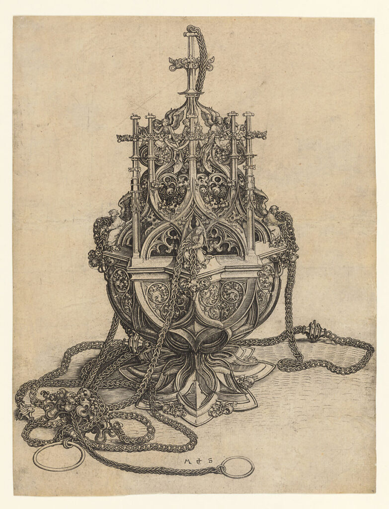 Maar Schongauers uitbeeldingen van kelken, monstransen en andere kerkelijke voorwerpen verraden inzicht in de manier waarop dergelijke werken werden gemaakt. Een gravure met een voorstelling van een wierookvat (1470-1475) toont bijvoorbeeld het delicaat vormgegeven, opengewerkte object, compleet met sierlijke gotische traceringen, gedetailleerde bloemmotieven en figuurtjes van engelen. Die doen tegelijkertijd dienst als bevestigingspunten van de kettingen waaraan zo’n vat gevuld met smeulende wierook heen en weer wordt geschommeld.