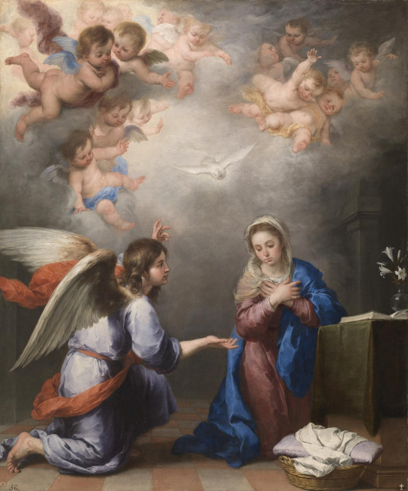 “De Annunciatie” van de Spaanse barokschilder Bartolomé Esteban Murillo, rond 1655-1660 Een tafereel uit het Nieuwe Testament (Lucas 1, 26-38) dat de aankondiging van de aartsengel Gabriël aan de Maagd Maria uitbeeldt, en haar aanvaarding van het feit dat zij door de tussenkomst van de Heilige Geest de Moeder van God zal worden. De Maagd wordt vergezeld door drie van haar traditionele attributen: een naaimand en een boek, die haar harde werk en toewijding symboliseren; en een boeket lelies, dat haar zuiverheid symboliseert. Dit devotionele schilderij behoorde tot een type eenvoudige en zeer tedere werken die na de pestepidemie van 1649 zeer populair waren in Sevilla. Dit doek werd in 1729-1733 in Sevilla verworven door koningin Isabel de Farnesio en staat vermeld in de inventaris van het paleis La Granja uit 1746 en de inventaris van het paleis Aranjuez uit 1749, beide in Madrid.