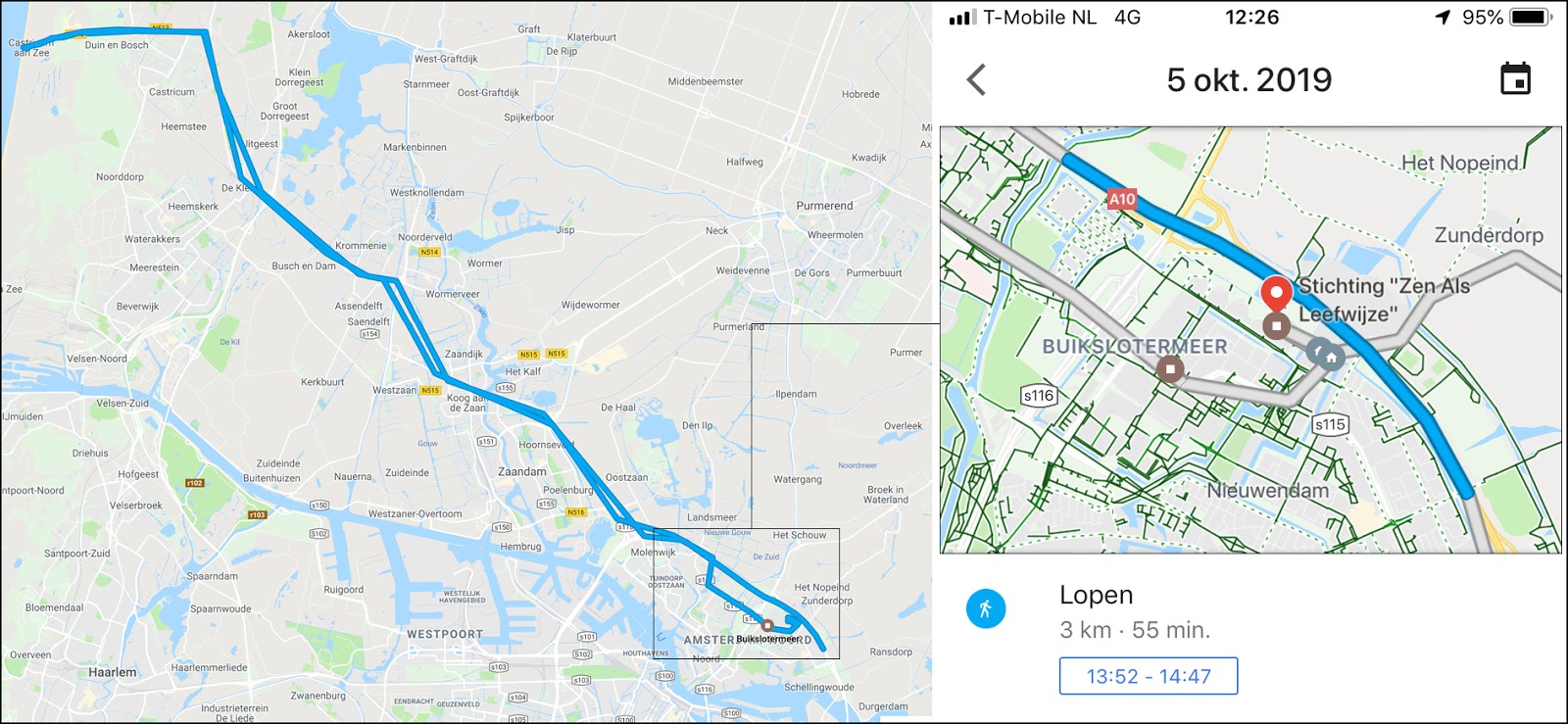 Google Maps Tijdlijn 5 okt 2019. Rechts een iPhone screenshot detailkaartje. Onze Stichting âZen als Leefwijzeâ kreeg, als âfirmaâ, van Google een âspeldâ. [klik om te vergroten] |