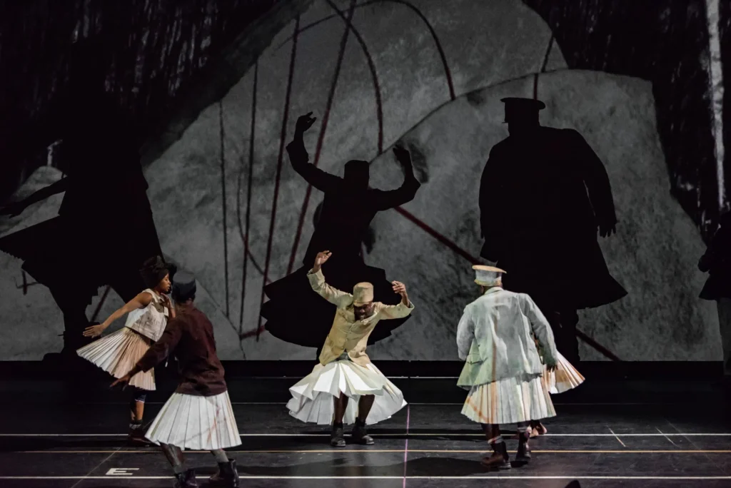Wat Linyekula ‘onbegrepen’ noemt, heet bij Kentridge ‘welbewust onwetend’ ofwel ‘verzwegen’. The Head & The Loadis vormgegeven als een processie, waarin tientallen personages voorbij komen. In een van de mooiste scènes glijdt een reusachtig oorlogsschip over de golven van de oceaan. Het schip vaart niet, het wordt gedragen. Het volle gewicht rust als een last (the load) op het hoofd (the head) van Afrikaanse soldaten. Tijdens de strijd om de Duitse koloniën in de Eerste Wereldoorlog transporteerden deze zwarte dragers gewonde Europese militairen, ze sjouwden door de jungle met kanonnentuig, zelfs schepen van de ene rivier naar de andere. Sterft er een, geen nood, er staat alweer een volgende gereed.