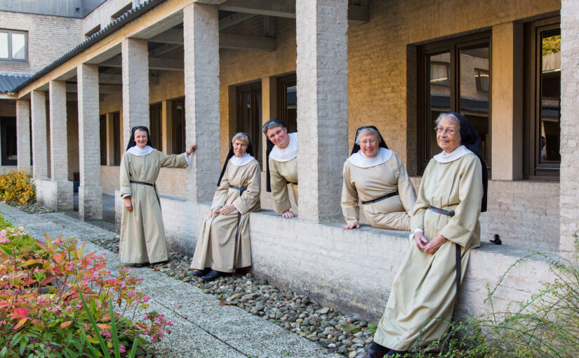 Zusters van de congregatie Kanunnikessen van het Heilige Graf in de binnentuin van de Priorij Emmaus in Maarssen, waar de sessies van Maarten Houtman gehouden werden.