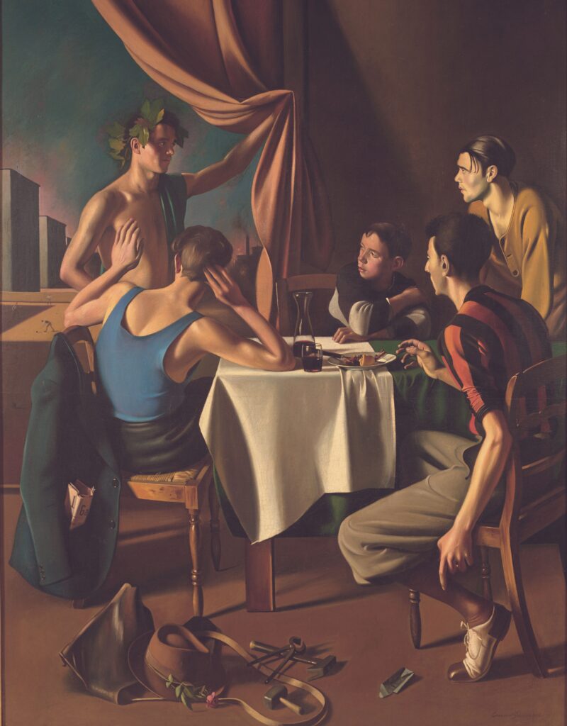 Hoogst curieus is Sciltians Bacchus in de herberg (1936) uit het museum voor moderne kunst in Rome. Vier jonge mannen aan een gedekte tafel worden verrast door de halfnaakte Bacchus, god van wijn en dronkenschap. De compositie met evenwichtig verdeeld geel, rood, groen en blauw, het theatrale licht, de blikken en houdingen en de stillevens op en om de tafel doen allemaal aan Caravaggio denken – en toch blijkt uit bijvoorbeeld de kleding en de kapsels meteen dat we in de jaren dertig van de twintigste eeuw zijn. Het desolate stadsgezicht achter Bacchus heeft Sciltian van De Chirico geleend. Uiteindelijk is het een tamelijk lelijk, geforceerd schilderij. Make Italy great again. Maar je blijft toch een tijd staan kijken, want boeiend is het wel. En daarin is het representatief voor Magico! Er zullen weinig bezoekers wildenthousiast over het Italiaanse realisme naar buiten lopen, maar het is een welkome, leerzame tentoonstelling die je in geen enkel ander Nederlands museum te zien krijgt.