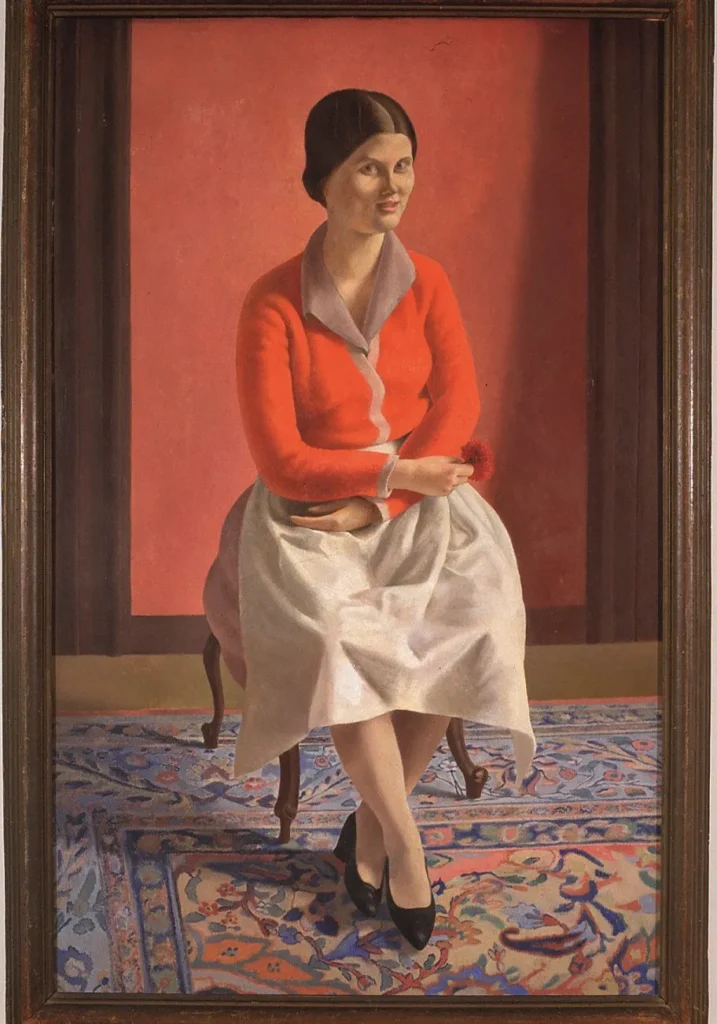 Francesca (1927) van Carlo Levi zit in rustig strijklicht te poseren op een stoeltje op een tapijt met veel blauwen en roden; haar rode vest oogt lekker warm tegen een wat gedempter rode achterwand die ook al warm is – maar met haar valse poppenblik en haar helmachtige kapsel (met strakke middenscheiding) wint ze geheid iedere auditie voor een hoofdrol in een horrorfilm. Een door Mario Reviglione geportretteerde theoloog, helemaal in het zwart en met een strenge blik onder de zwarte hoed, is ook op een filmische manier griezelig.