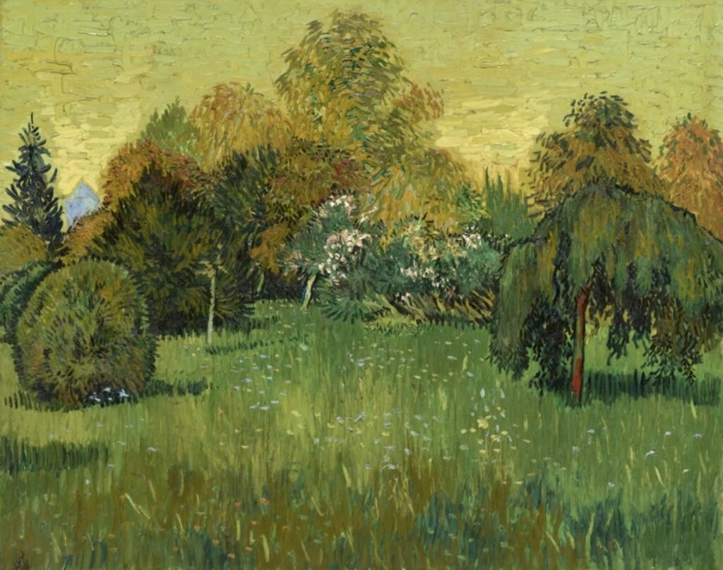 In dit schilderij legde Van Gogh de openbare tuin in Arles vast, tegenover het Gele Huis. Hij noemde het 'De Dichterstuin'. De halve cirkel van bomen en struiken rond het intieme en uitnodigende centrum van het schilderij lijkt op een gezin dat in hun woonkamer bijeen is. Ze lijken ons uit te nodigen om ons bij hen te voegen in deze gelukkige plek. Dit was geen toeval; Van Gogh hoopte dat zijn vriend, de schilder Paul Gauguin (de 'dichter' uit de titel), hem in het Gele Huis zou komen opzoeken en schilderde dit werk om zijn kamer te versieren.