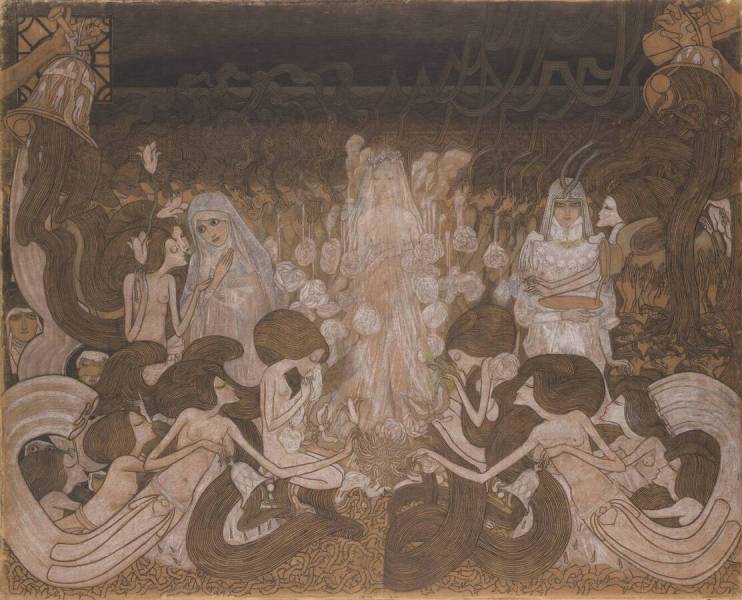 “De midden figuur van de biddende non in oranje habijt baseert Toorop op de jonge, katholieke dichter Miek Janssen (1890 tot 1953). Tussen hen bestaat sinds 1912 een hechte vriendschap, volgens sommigen zelfs een liefdesrelatie. Janssen is meer dan Toorops muze, er is sprake van een wederzijds inspirerende samenwerking: Jan maakt illustraties bij de gedichten van Miek, en Miek schrijft verklaringen bij Jan’s werk.”