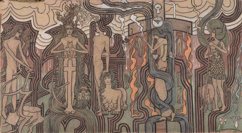 Nee, eerlijk gezegd kon Toorop – in 1858 geboren op Java en in 1928 in Den Haag begraven, haast als een nationale held – niet veel zinnigs over zijn werk zeggen. Dat blijkt uit zijn teksten en redevoeringen: het was gemompel of gezwollen taal, en anders kroop hij wel achter de piano om zijn werk te duiden.
